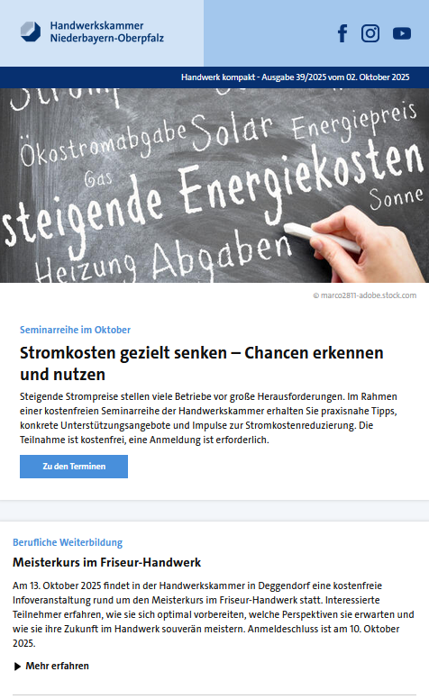 ‚Handwerk kompakt‘ ist ein Newsletter-Service von Holzmann Medien für die Handwerkskammern in Deutschland. Diese bieten den Newsletter exklusiv ihren Mitgliedsbetrieben an. Je nach Bedarf wöchentlich, zwei- oder vierwöchentlich. Die aktuelle Empfängerzahl liegt bei knapp 58.500, verteilt auf acht Handwerkskammern.